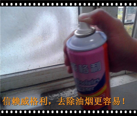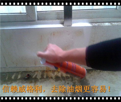 8、廚房的玻璃上和墻壁上也沾滿了油漬,有時候還有一些小飛蟲的尸體等亂七八糟的東西,我們用洗多多罐裝泡沫油煙機清洗劑,輕輕一噴,雪花狀的泡沫就會灑滿到臟玻璃和墻壁上,很快的和油漬起反應。